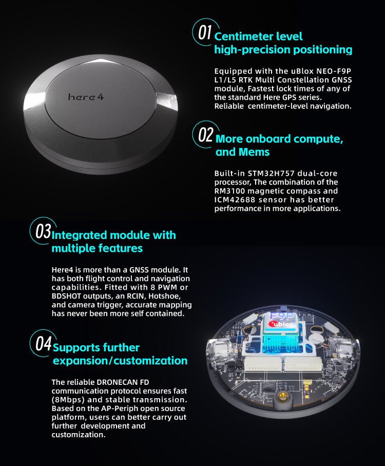 The Here 4 is a professional High Precision Dual-band RTK Navigation module. It supports multiple GNSS options such as BeiDou, Galileo, GLONASS, GPS, QZSS.
