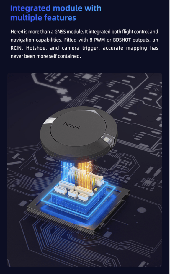 The Here 4 goes beyond being a simple GNSS module. It combines flight control and navigation functionalities into a single device. With 8 PWM or BDSHOT outputs, an RCIN, Hotshoe, and camera trigger, it offers a self-contained solution for accurate mapping and precise control capabilities.